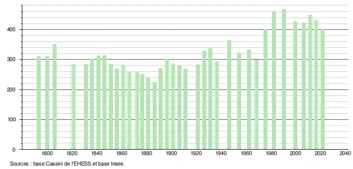 L'évolution du nombre d'habitants est connue à travers les recensements de la population effectués dans la commune depuis 1793. Pour les communes de moins de 10 000 habitants, une enquête de recensement portant sur toute la population est réalisée tous les cinq ans, les populations légales des années intermédiaires étant quant à elles estimées par interpolation ou extrapolation[13]. Pour la commune, le premier recensement exhaustif entrant dans le cadre du nouveau dispositif a été réalisé en 2006[14].