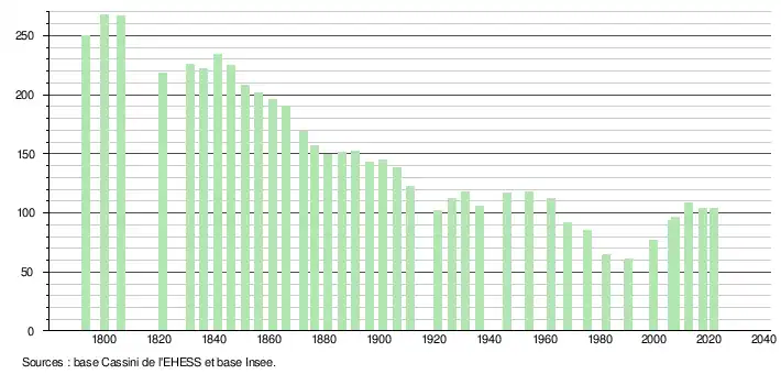 L'évolution du nombre d'habitants est connue à travers les recensements de la population effectués dans la commune depuis 1793. Pour les communes de moins de 10 000 habitants, une enquête de recensement portant sur toute la population est réalisée tous les cinq ans, les populations légales des années intermédiaires étant quant à elles estimées par interpolation ou extrapolation[19]. Pour la commune, le premier recensement exhaustif entrant dans le cadre du nouveau dispositif a été réalisé en 2007[20].