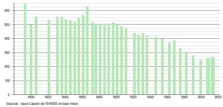 L'évolution du nombre d'habitants est connue à travers les recensements de la population effectués dans la commune depuis 1793. À partir du , les populations légales des communes sont publiées annuellement dans le cadre d'un recensement qui repose désormais sur une collecte d'information annuelle, concernant successivement tous les territoires communaux au cours d'une période de cinq ans. Pour les communes de moins de 10 000 habitants, une enquête de recensement portant sur toute la population est réalisée tous les cinq ans, les populations légales des années intermédiaires étant quant à elles estimées par interpolation ou extrapolation[25]. Pour la commune, le premier recensement exhaustif entrant dans le cadre du nouveau dispositif a été réalisé en 2007[26],[Note 1].