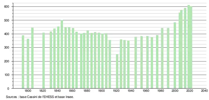 L'évolution du nombre d'habitants est connue à travers les recensements de la population effectués dans la commune depuis 1793. Pour les communes de moins de 10 000 habitants, une enquête de recensement portant sur toute la population est réalisée tous les cinq ans, les populations légales des années intermédiaires étant quant à elles estimées par interpolation ou extrapolation[23]. Pour la commune, le premier recensement exhaustif entrant dans le cadre du nouveau dispositif a été réalisé en 2008[24].