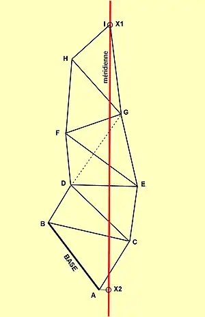 Le principe de triangulation d'une méridienne s'appuie sur la triangulation élémentaire (voir figure) : à partir d'un premier triangle-plan ABC, dont on mesure un côté - la base AB - et les angles[N 1], on peut, trigonométriquement, déterminer les deux autres côtés. Ce premier triangle défini, on détermine, à partir de l'un de ses côtés (ici BC), un deuxième triangle adjacent BCD et, de proche en proche, un réseau de triangles dont les sommets sur le terrain, sont situés, au mieux, de part et d'autre de l'arc de méridien à mesurer[2].