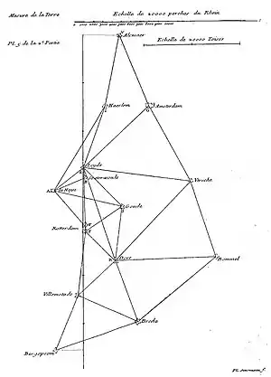 À l'origine, il choisit treize stations[15] (du point A au point N sur la figure) pour construire treize grands triangles, mais il commence par mesurer une base AB entre le moulin de Villejuif jusqu'au pavillon de Juvisy : « On prit quatre bâtons de pique, bien droits, que l'on assembla deux à deux ; & on les coupa de quatre toises (≈ 7,8 m)[N 7] de longueur chacune. Les extrémités en étaient garnies de plaques de cuivre, pour que l'on pût les appliquer l'un au bout de l'autre, le long d'un grand cordeau bien tendu, en s'alignant à chaque fois qu'on le changeait de place, aux deux termes de cette base ; en sorte que l'on relevait un de ces bâtons, pendant que l'autre demeurait immobile à terre ; auquel on le rappliquait par l'autre bout en avançant toujours dans le même alignement. ». Deux mesurages donnent alors 5 662 toises 5 pieds et 5 663 toises 1 pied. Soit 5 663 toises ± 1 pied[N 8] ; C'est cette valeur moyenne (≈ 11 026 m) qui sera retenue.