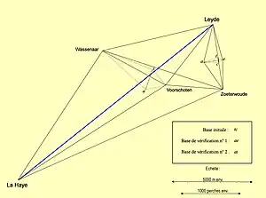 Cette triangulation auxiliaire est composée de 14 triangles. Entre Leyde et Zoeterwoude, il mesure une base tc = 85,05 perches (319,8 m)[N 3]. Par triangulation, il calcule et mesure ensuite une première base de vérification ae ; par le calcul, il trouve ae = 326,43 p, et plusieurs mesurages lui donnent une valeur moyenne de 326,90 p[8]. Il s'en tient à la valeur calculée « et l'erreur sur ae est déjà d'une demi-perche environ, ou 1/600.» Partant de cette nouvelle base, il calcule la distance entre Leyde et Zoeterwoude LZ = 1092,33 p, puis de proche en proche, il parvient à déterminer la distance de Wassenaar à Voorschoten qu'il vérifie par la mesure d'une nouvelle base ai qui correspond au calcul au centième de perche près[9]. Il termine par la distance Leyde - La Haye LH = 4103,36 p, qu'il vérifie à 0,15 p près par un triangle auxiliaire LHZ.