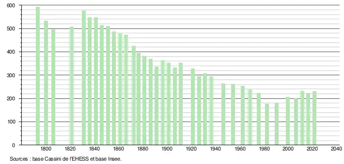 L'évolution du nombre d'habitants est connue à travers les recensements de la population effectués dans la commune depuis 1793. Pour les communes de moins de 10 000 habitants, une enquête de recensement portant sur toute la population est réalisée tous les cinq ans, les populations légales des années intermédiaires étant quant à elles estimées par interpolation ou extrapolation[16]. Pour la commune, le premier recensement exhaustif entrant dans le cadre du nouveau dispositif a été réalisé en 2006[17].