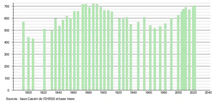 L'évolution du nombre d'habitants est connue à travers les recensements de la population effectués dans la commune depuis 1793. Pour les communes de moins de 10 000 habitants, une enquête de recensement portant sur toute la population est réalisée tous les cinq ans, les populations légales des années intermédiaires étant quant à elles estimées par interpolation ou extrapolation[23]. Pour la commune, le premier recensement exhaustif entrant dans le cadre du nouveau dispositif a été réalisé en 2004[24].