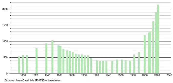 L'évolution du nombre d'habitants est connue à travers les recensements de la population effectués dans la commune depuis 1793. Pour les communes de moins de 10 000 habitants, une enquête de recensement portant sur toute la population est réalisée tous les cinq ans, les populations légales des années intermédiaires étant quant à elles estimées par interpolation ou extrapolation[21]. Pour la commune, le premier recensement exhaustif entrant dans le cadre du nouveau dispositif a été réalisé en 2008[22].