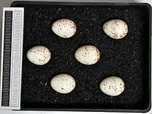 Une première couvée est pondue en avril, puis parfois une seconde en juin. Les couvées comptent de 7 à 10 œufs de 16 mm blancs, avec des taches marron. L'incubation est assurée par la femelle elle dure de 13 à 15 jours. Les oisillons prennent leur premier envol après 16 à 20 jours et quittent le nid après 20 à 22 jours[2],[3].