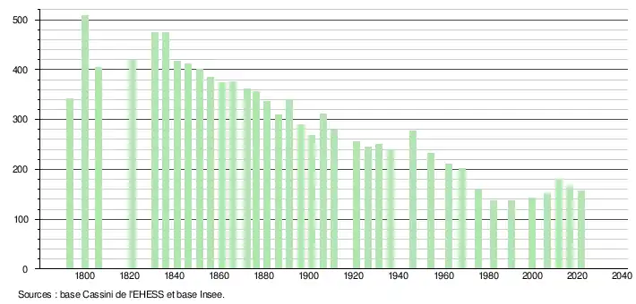 L'évolution du nombre d'habitants est connue à travers les recensements de la population effectués dans la commune depuis 1793. Pour les communes de moins de 10 000 habitants, une enquête de recensement portant sur toute la population est réalisée tous les cinq ans, les populations légales des années intermédiaires étant quant à elles estimées par interpolation ou extrapolation[18]. Pour la commune, le premier recensement exhaustif entrant dans le cadre du nouveau dispositif a été réalisé en 2006[19].