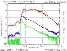 Flux de protons de haute énergie mesurés par le satellite GOES. Le flux est mesuré pour des protons de plus de 10 MeV, 50 MeV et 100 MeV. - en émettant des particules de grande énergie. Les éruptions solaires ont généralement pour effet d’accélérer des particules élémentaires chargées (protons, électrons, noyaux d’hélium…) jusqu’à de hautes énergies, pouvant aisément dépasser 1 MeV. Ces particules se propagent ensuite dans l’espace interplanétaire, en suivant les lignes de champ magnétique. Elles sont parfois accélérées davantage par la traversée d’ondes de choc. Ces particules mettent 30 minutes à 1 heure pour atteindre la Terre. Elles ne pénètrent heureusement guère à l’intérieur de la magnétosphère car le champ magnétique terrestre les dévie et fait ainsi office de blindage. Seules les éruptions les plus violentes peuvent être détectées au niveau du sol (surtout à haute latitude) par l’arrivée de neutrons issus de réactions nucléaires dans l’atmosphère. Il s’agit de Ground Level Enhancements (GLE), dont un des plus puissants s’est produit le . L’image de droite illustre l’augmentation du flux de protons observée lors d’une autre éruption violente, qui s’est produite le . Comme l’échelle verticale est logarithmique, le flux augmente d’un facteur 100 à 1 000 pendant l’éruption. Des telles éruptions sont plus fréquentes pendant les périodes de forte activité solaire et peu après. La dernière période de forte activité s’étendait de 2000 à 2004 environ. Des particules de haute énergie se rencontrent aussi dans les ceintures de rayonnement (ceintures de radiation, ou encore ceintures de Van Allen), une région annulaire qui entoure la Terre et dans laquelle des particules peuvent rester piégées pendant des mois. Ces particules pénètrent profondément dans la matière et peuvent à la longue causer des dégâts considérables. Les éruptions les plus violentes peuvent tuer un astronaute en quelques minutes, si ce dernier ne se trouve pas à l’abri.