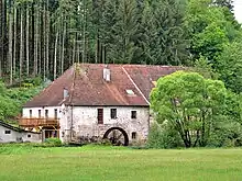 - Moulin de Cubolot sur la Sarre rouge avec sa roue à aubes en dessous[21].