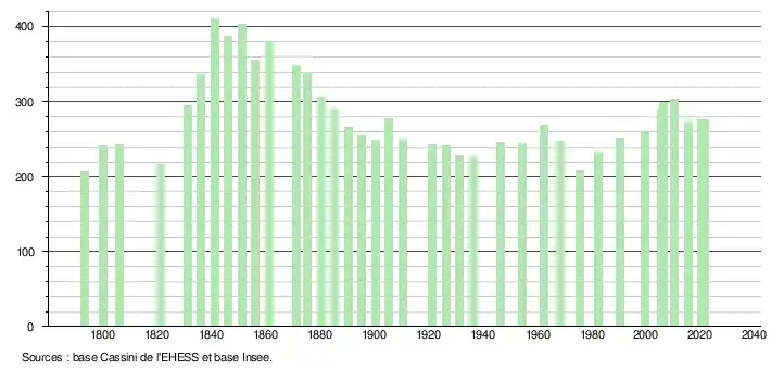 L'évolution du nombre d'habitants est connue à travers les recensements de la population effectués dans la commune depuis 1793. Pour les communes de moins de 10 000 habitants, une enquête de recensement portant sur toute la population est réalisée tous les cinq ans, les populations légales des années intermédiaires étant quant à elles estimées par interpolation ou extrapolation[17]. Pour la commune, le premier recensement exhaustif entrant dans le cadre du nouveau dispositif a été réalisé en 2005[18].