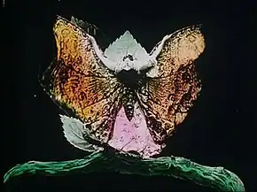 - Joshua Yumibe décrit ainsi le film : « Une chenille jaune rampe sur une feuille verte posée sur un fond noir. La chenille se transforme en un cocon blanc dont émerge un papillon aux ailes multicolores. Dans le plan suivant les ailes du papillon sont complètement déployées et chatoient de diverses couleurs (orange, bleu-vert, jaune). Puis intervient une nouvelle transformation, le papillon se révèle être une femme vêtue en papillon (son corps entier est désormais visible), qui continue à battre des ailes et à faire des pirouettes. Le fond noir a deux fonctions ici : il masque toutes les éventuels débordements du coloriage (les teintes n'apparaissant pas sur le fond noir) et forme un contraste avec les couleurs changeantes qui semblent sortir de l'écran. La mise en couleur ajoute une profondeur à l'espace, mais sans créer la sensation d'un espace profond dans lequel le spectateur est invité à entrer. L'image colorée semble plutôt se projeter hors de l'écran et s'adresser directement au spectateur d'une manière quasi érotique[2]. »