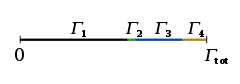 - On choisit un deuxième nombre aléatoire U' uniformément réparti entre 0 et Γtot qui va servir à tirer au hasard l'état final de la transition (voir la figure ci-contre).