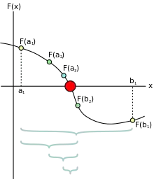 La méthode de dichotomie ou méthode de la bissection est, en mathématiques, un algorithme de recherche d'un zéro d'une fonction qui consiste à répéter des partages d’un intervalle en deux parties puis à sélectionner le sous-intervalle dans lequel existe un zéro de la fonction.