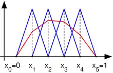 La plus simple est l'emploi des polynômes de Lagrange. Dans cette méthode les fonctions de base valent 1 à un nœud du maillage et 0 à tous les autres. La fonction de base i est alors la fonction valant 1 au nœud i et 0 sur les autres nœuds et qui est polynomiale sur chaque élément. Un exemple de telles fonctions est représenté en dimension 1 à côté. Il y a autant de fonctions de base par élément que de nombre de nœuds.