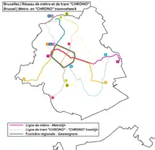 Le métro de Bruxelles est un moyen de transport en commun rapide desservant une grande partie de la région de Bruxelles-Capitale en Belgique. Il consiste en quatre lignes de métro lourd en site propre, les lignes 1, 2, 5 et 6, totalisant 39,9 de kilomètres de voies[2], dont 37,5 km souterraines[3]. Le réseau prémétro consiste en trois lignes de trams (lignes 3, 4 et 7) partiellement souterraines qui offrent, sur la majeure partie de leurs parcours, un service comparable à celui du métro. Le métro possède cinquante-neuf stations de métro lourd, quinze de prémétro, sept ayant une correspondance avec une autre ligne. Avec 39,9 km (lignes de prémétro non comptées), il est classé 92e du monde en longueur.