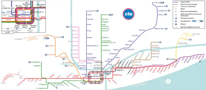 - (en) All CTA trains have accessible features, including locations inside cars where a wheelchair can be secured (consulté le 3 avril 2023)