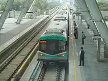 Les 42 trains des deux lignes sont constitués de trois véhicules chacun, deux véhicules motorisés à l'avant et à l'arrière, un véhicule remorque intermédiaire[24]. Le corps des véhicules est en acier inoxydable, largeur de 3,15 m et longueur de 65,45 m. Les véhicules sont climatisés. La capacité de chaque train est 755 passagers calculée avec une densité de 5 passagers par m2. La vitesse maximale des trains peut atteindre 90 km/h.