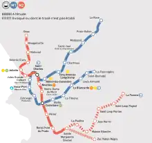 Le réseau comporte deux lignes, nommées M1 et M2, desservant 29 stations et s'étendant sur 22,3 kilomètres. Le tracé de la ligne 1 présente une forme en C, dont les deux branches s'étendent suivant une direction est-ouest. La ligne 2 suit un tracé essentiellement orienté le long d'un axe nord-sud[39]. Le métro marseillais est en grande partie souterrain, mais comprend des tronçons aériens :