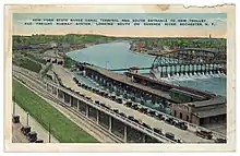 Carte postale de 1928 présentant la station Court Street avec la rivière Genesee en arrière-plan.