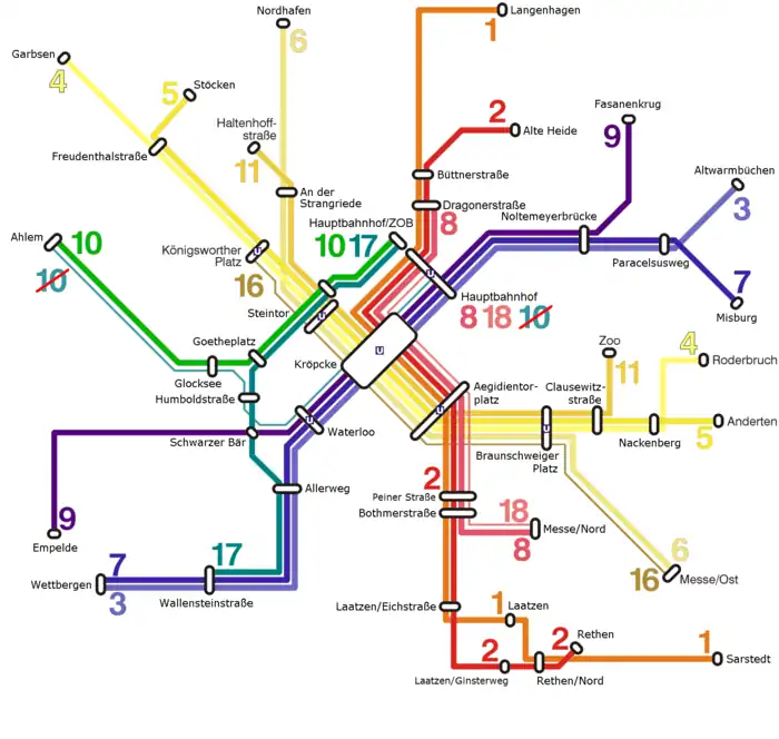 | Les lignes vers Laatzen/Süd et Rethen ont été construites sous la forme d'un métro léger, mais ont été exploitées en tramway jusqu'en . | |||