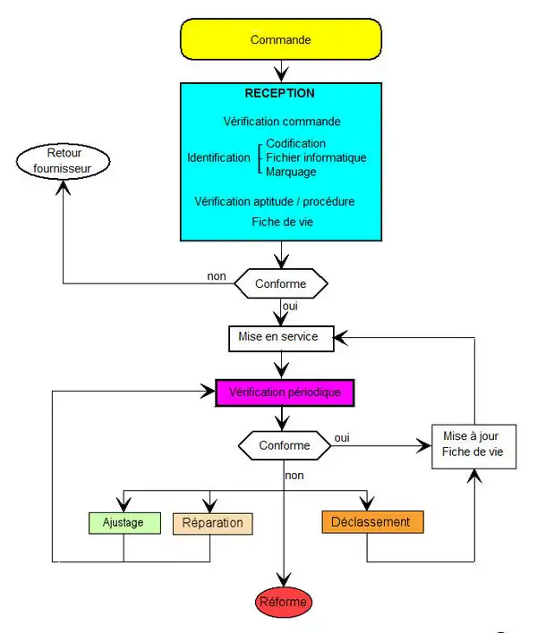 Après mise en service, des vérifications ont pour objet de s'assurer périodiquement que les performances des appareils (étalons compris) demeurent dans les limites de conformité. Ces vérifications, suivant feuille d'instructions, sont consignées sur une fiche de vie pour assurer la traçabilité métrologique.