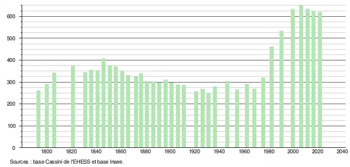 L'évolution du nombre d'habitants est connue à travers les recensements de la population effectués dans la commune depuis 1793. Pour les communes de moins de 10 000 habitants, une enquête de recensement portant sur toute la population est réalisée tous les cinq ans, les populations légales des années intermédiaires étant quant à elles estimées par interpolation ou extrapolation[26]. Pour la commune, le premier recensement exhaustif entrant dans le cadre du nouveau dispositif a été réalisé en 2006[27].