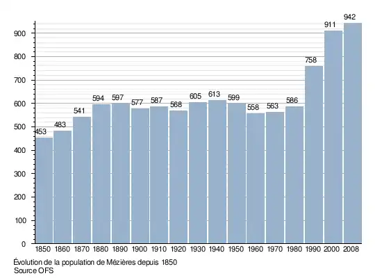 Selon l'Office fédéral de la statistique, Mézières possède 1 081 habitants en 2022[1]. Sa densité de population atteint 121 hab./km2.