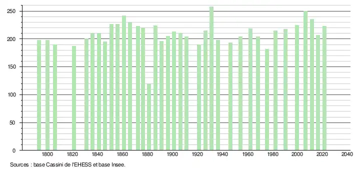 L'évolution du nombre d'habitants est connue à travers les recensements de la population effectués dans la commune depuis 1793. Pour les communes de moins de 10 000 habitants, une enquête de recensement portant sur toute la population est réalisée tous les cinq ans, les populations légales des années intermédiaires étant quant à elles estimées par interpolation ou extrapolation[16]. Pour la commune, le premier recensement exhaustif entrant dans le cadre du nouveau dispositif a été réalisé en 2006[17].