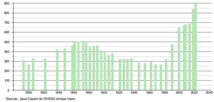 L'évolution du nombre d'habitants est connue à travers les recensements de la population effectués dans la commune depuis 1793. Pour les communes de moins de 10 000 habitants, une enquête de recensement portant sur toute la population est réalisée tous les cinq ans, les populations légales des années intermédiaires étant quant à elles estimées par interpolation ou extrapolation[12]. Pour la commune, le premier recensement exhaustif entrant dans le cadre du nouveau dispositif a été réalisé en 2008[13].