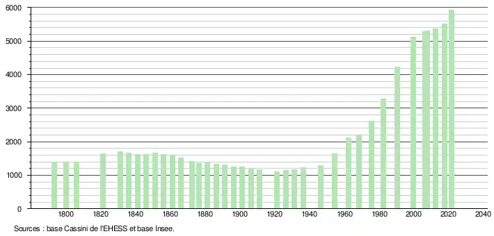 L'évolution du nombre d'habitants est connue à travers les recensements de la population effectués dans la commune depuis 1793. Pour les communes de moins de 10 000 habitants, une enquête de recensement portant sur toute la population est réalisée tous les cinq ans, les populations légales des années intermédiaires étant quant à elles estimées par interpolation ou extrapolation[38]. Pour la commune, le premier recensement exhaustif entrant dans le cadre du nouveau dispositif a été réalisé en 2007[39].