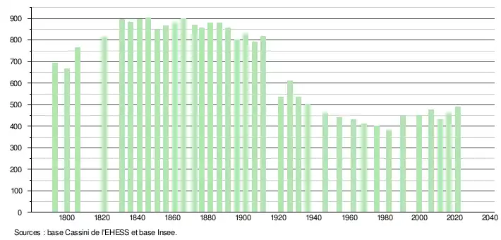 L'évolution du nombre d'habitants est connue à travers les recensements de la population effectués dans la commune depuis 1793. Pour les communes de moins de 10 000 habitants, une enquête de recensement portant sur toute la population est réalisée tous les cinq ans, les populations légales des années intermédiaires étant quant à elles estimées par interpolation ou extrapolation[20]. Pour la commune, le premier recensement exhaustif entrant dans le cadre du nouveau dispositif a été réalisé en 2006[21].