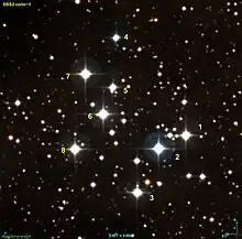 On peut décrire la figure formée par les huit étoiles les plus brillantes visibles dans la région de l'amas comme un quadrilatère (avec une extension vers le nord-ouest) surmonté d'un triangle. Ces étoiles sont représentées sur la figure ci-dessous par ordre croissant d'ascension droite de 1 à 7.