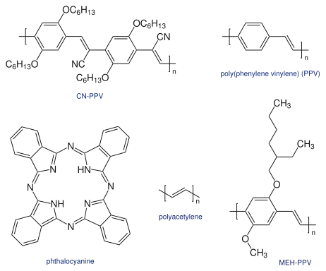 Le MEH-PPV — in extenso poly[2-méthoxy-5-(2-éthyl-hexyloxy)-1,4-phénylène-vinylène] — est un polymère semiconducteur de type p (donneur d'électrons) étudié pour former des jonctions p-n, notamment avec le PCBM comme matériau de type n (accepteur d'électrons), permettant de réaliser des cellules photovoltaïques en polymères ayant un bon rendement énergétique[2],[3].
