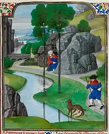 - Dans le manuscrit Profits ruraux des champs de Pietro de' Crescenzi[25], traduction française de Jean Corbechon, le frontispice est attribué au Maître du Froissart du Getty, et les autres[26] au Maître aux inscriptions blanches.