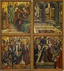 - Un retable dédié à la Vierge dont les panneaux sont partagés entre le Germanisches Nationalmuseum de Nuremberg, l'Alte Pinakothek de Munich et le Belvedere de Vienne[1].