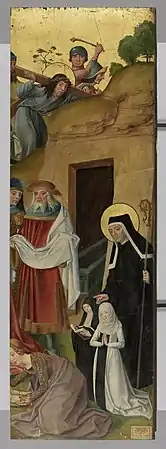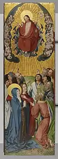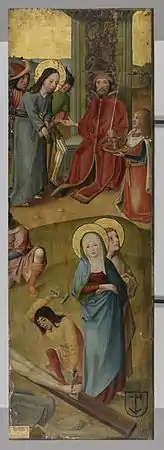 - Un volet de retable, 128 × 80 cm, au musée Suermondt-Ludwig à Aix-la-Chapelle[23]. L'intérieur du volet montre avec les martyres de Quirin de Neuss et Balbine de Rome, l'extérieur montre l'Ascension et le Couronnement de Marie.