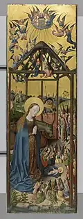 - Madone apocalyptique. Marie sur un croissant de lune brun, saluée par Dieu le Père avec des saints et la famille du comte Gumprecht II of Neuenahr (en). Tableau créé après la mort du comte en 1484. La partie centrale (128,7 × 47cm) dépasse en hauteur les parties latérales 84,2 × 179,5 cm: la photo montre le tableau dans la bibliothèque. Provient du couvent des cisterciennes de Mariengarten, Cologne. Il se trouve au Wallraf-Richartz-Museum[21]. Les apôtres et saint sont, sur la partie gauche, Georges en armure et avec bannière, Matthieu, Jacques l'Ancien, sur la partie droite André avec sa croix, Jérôme et Laurent. Les hommes en armure à gauche sont emmenés probablement par le compte, devant un prie-dieu portant le blason de la famille; à droite les femmes, emmenées probablement par l'épouse, protégée par André. Entre les deux, et sous la Madone, un paysage montrant le mont Golgotha avec les trois croix des crucifiés, entourés des personnages de la Passion, et plus en avant une Lamentation.