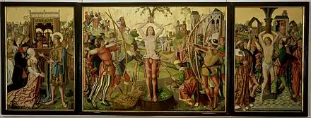 Le Sebastian-Altar est peint vers 1493/94, Le panneau central est immense 186 × 257,5 cm[19]. D'après La Légende dorée, Sébastien, militaire, soutient ses coreligionnaires dans leur foi, ce qui est illustré dans la partie gauche du retable où il encourage deux prisonniers chrétiens (derrière les barreaux), les jumeaux Marc et Marcellin. Une femme muette nommée Zoé s'approche du militaire, qui lui rend alors la parole. Les personnes présentes sont impressionnées et se convertissent. Dans le panneau central, Sébastien est attaché à une colonne et transpercé de flèches. On voit, à droite derrière Sébastien, qu'il est détaché de la colonne, et ensuite est transporté dans une maison où il guérit miraculeusement. Enfin, et c'est le thème du panneau de droite, il est tué à coups de verges. Son corps est jeté ensuite dans la Cloaca Maxima qui se déverse dans le Tibre. Au fond de la peinture on voit, à gauche de la colonne à laquelle Sébastien est attaché, des toilettes comme elles devaient exister à l'époque où la peinture est réalisée, et à droite une entrée dans une sorte de bain public.