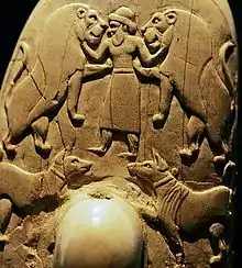 D'autres représentations associées montrent un personnage contrôlant ou « apprivoisant » un seul animal, généralement à droite du personnage. Mais les nombreuses représentations de héros ou de rois tuant un animal se distinguent de celles-ci<[6].