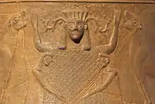 Sceau-timbre en terre cuite avec motif du Maître des animaux, Tell Telloh, ancien Girsu, Fin de la période d'Obeïd, vers 4000 av. J.-C.[16],[17].