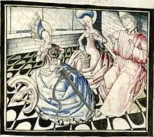 - ce manuscrit de Raoul Lefèvre est, d'après la notice, enluminé « dans le style du Maître du Champion des dames ». Il comporte 106 folios, écrites sur papier. Il contient douze miniatures en grisaille[4].