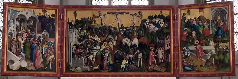 Le panneau central est partagé entre un tableau presque carré et deux ailes, elles-mêmes composées chacune de deux petits tableaux. Au centre est une scène de crucifixion, avec le Christ sur une croix très haute aux pieds de laquelle est agenouillée Marie Madeleine. À gauche, le bon larron, reconnaissable à l'ange blanc qui l'accueille, à droite le mauvais dont l'âme est prise par un diable noir. Au fond se détache, sur un arrière-plan doré, une belle ville médiévale faite de tourelles blanches aux toits d'ardoise, traversée par un fleuve. La foule aux pieds de la croix comporte tous les acteurs recensés du calvaire : le chevalier romain, le prêtre, le soldat qui perce le flanc du Christ à la lance. Certains sont identifiés par des banderoles. Le sol est couvert d'une végétation verte. À gauche, Marie en douleurs, soutenue par l'apôtre Jean et les autres Marie.