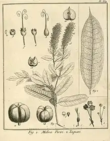 « MABEA (Piriri) foliis ovato - oblongis, acuminatis. (Tabula 334. Fig. 1.)Frutex trunco quinque-pedali ; ramos plures, ſarmentoſos, longiſſimos, ſuprà arbores ſparſos, & propendentes emittente. Folia alterna, ovato-oblonga, in acumen longum deſinentia, integerrima, ſuperne viridia, inferne albicantia, brevi petiolata. Stipulæ binæ, breves, anguſtæ, acutæ, deciduæ. Flores paniculati, denſiſſimi, maſculi terni, pedunculati, ab codem pedicello exeunt, ad baſim glandulis duabus & bradea muniuntur. Flores feminei infra maſculos, ſolitarii, pedunculati.