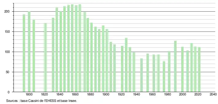 L'évolution du nombre d'habitants est connue à travers les recensements de la population effectués dans la commune depuis 1793. Pour les communes de moins de 10 000 habitants, une enquête de recensement portant sur toute la population est réalisée tous les cinq ans, les populations légales des années intermédiaires étant quant à elles estimées par interpolation ou extrapolation[16]. Pour la commune, le premier recensement exhaustif entrant dans le cadre du nouveau dispositif a été réalisé en 2006[17].