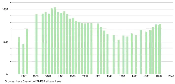 L'évolution du nombre d'habitants est connue à travers les recensements de la population effectués dans la commune depuis 1793. Pour les communes de moins de 10 000 habitants, une enquête de recensement portant sur toute la population est réalisée tous les cinq ans, les populations légales des années intermédiaires étant quant à elles estimées par interpolation ou extrapolation[17]. Pour la commune, le premier recensement exhaustif entrant dans le cadre du nouveau dispositif a été réalisé en 2005[18].