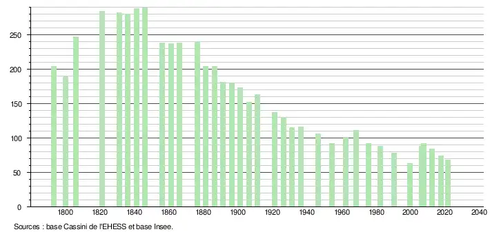 L'évolution du nombre d'habitants est connue à travers les recensements de la population effectués dans la commune depuis 1793. Pour les communes de moins de 10 000 habitants, une enquête de recensement portant sur toute la population est réalisée tous les cinq ans, les populations légales des années intermédiaires étant quant à elles estimées par interpolation ou extrapolation[23]. Pour la commune, le premier recensement exhaustif entrant dans le cadre du nouveau dispositif a été réalisé en 2007[24].