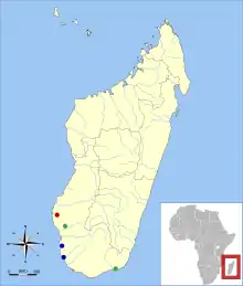 Cette espèce est endémique de la Forêt des Mikea dans le Sud-Ouest de Madagascar, mais les fossiles retrouvés indiquent une plus large aire de répartition dans le Sud de Madagascar. Les changements climatiques et la concurrence avec les espèces introduites peuvent avoir entraîné un changement dans sa répartition. La forêt de Mikea est menacée par les activités humaines.
