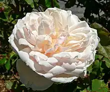 Il donne des bouquets intensément parfumés de 5 à 7 roses doubles de 10 cm de diamètre à 30 pétales crème à rosé.