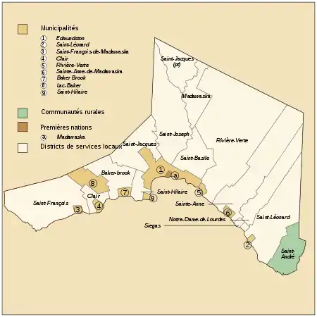 - Comté de Madawaska: Baker Brook, Paroisse de Baker Brook, Clair, Paroisse de Clair, Lac-Baker, Paroisse de Lac-Baker, Edmundston, Paroisse de Madawaska, Notre-Dame-de-Lourdes, Rivière-Verte, Paroisse de Rivière-Verte, Saint-André, Sainte-Anne-de-Madawaska, Paroisse de Sainte-Anne, Saint-Basile, Saint-Basile 10, Saint-François-de-Madawaska, Paroisse de Saint-François, Saint-Hilaire, Paroisse de Saint-Hilaire, Paroisse de Saint-Jacques, Saint-Joseph, Saint-Léonard, Paroisse de Saint-Léonard, Siegas.